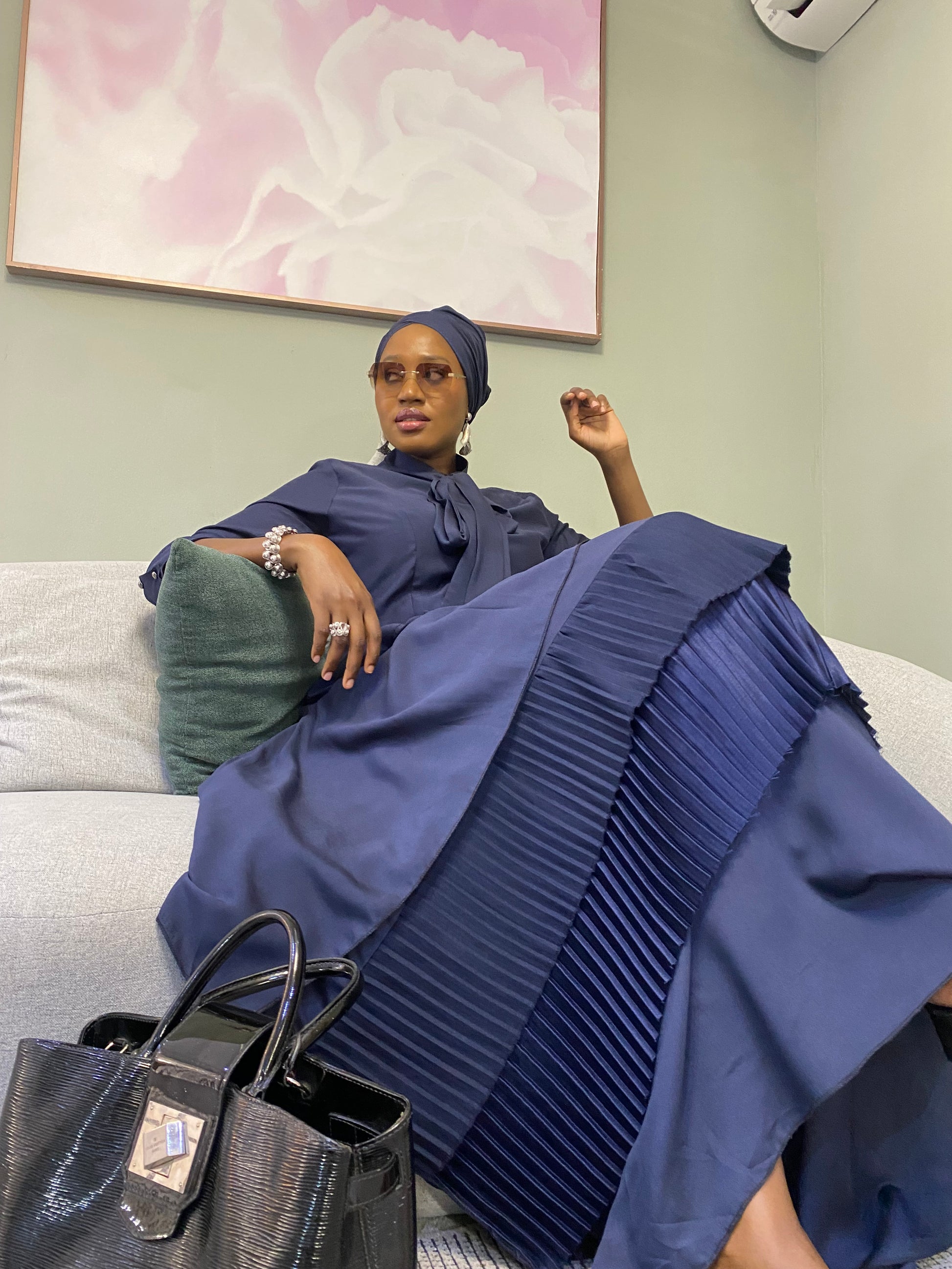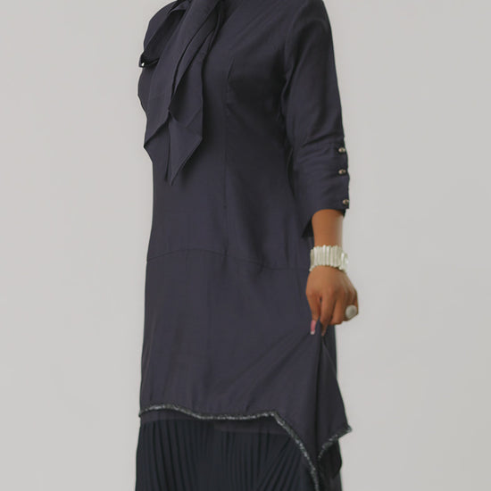 This elegant dress captures the essence of understated elegance and fluid movement. Cut from lightweight textured crepe, its layered hemline and soft drape create graceful flow with every step featuring a delicately beaded first layer that catches the light with subtle shimmer. The neckline features a fluid tie detail that can be styled as a bow or softly knotted for relaxed refinement.Designed for women who appreciate effortless dressing, this piece transitions seamlessly from day to evening, modest yet modern, fluid yet structured. The soft hue adds serenity, while the layered silhouette ensures timeless wearability.