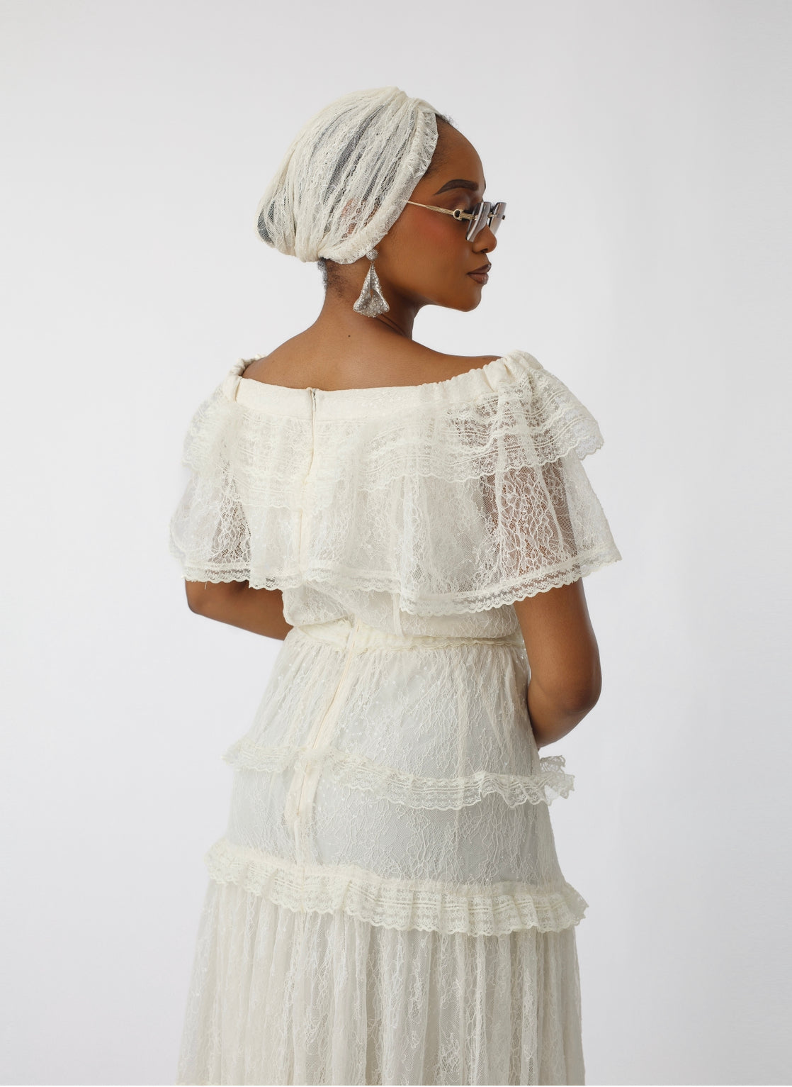 Finished with a matching lace turban, it’s designed for the woman who loves elegance without the fuss.