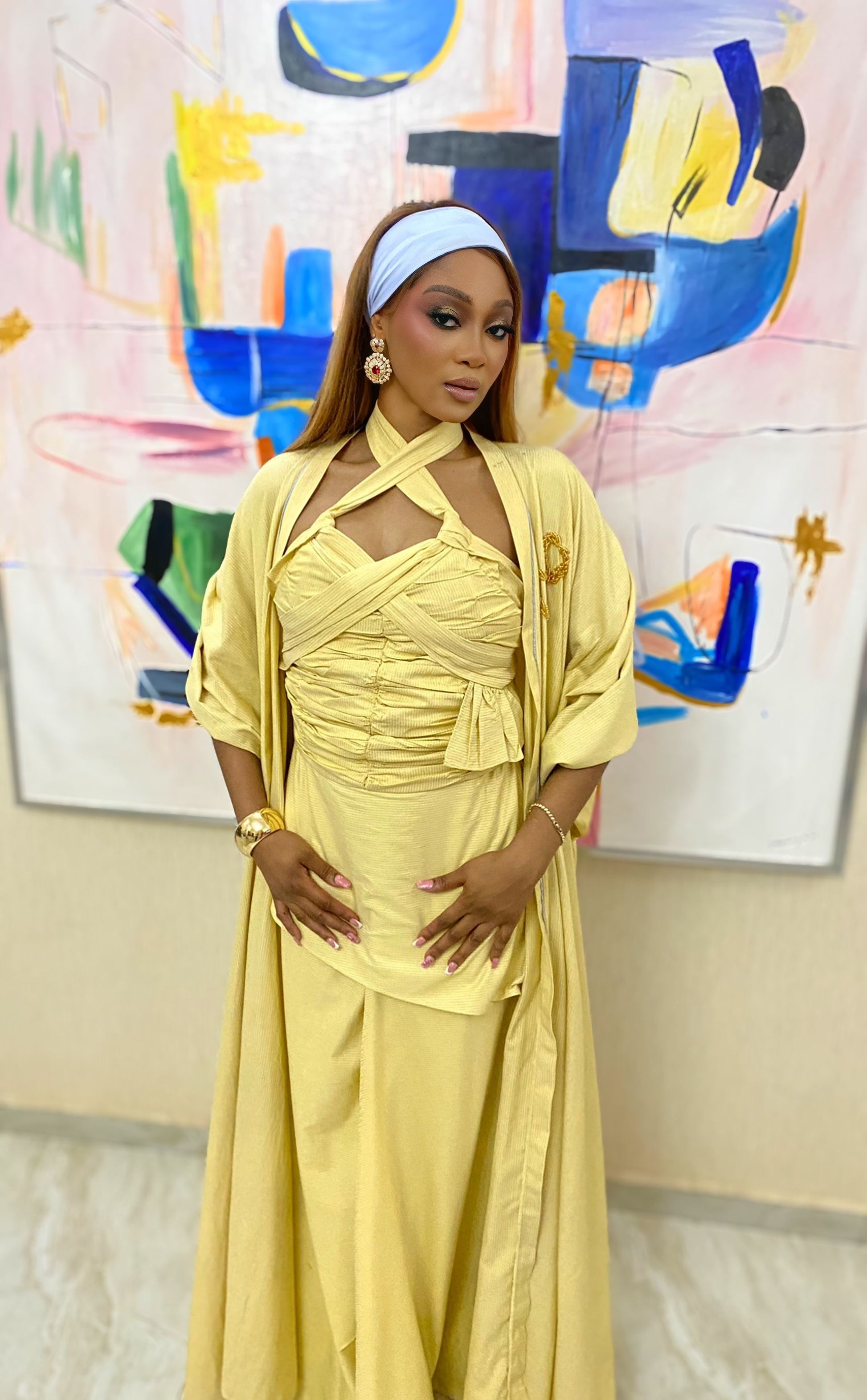 Crafted in a luminous butter-yellow fabric, this coordinated ensemble features a sculpted halter top, a flowing maxi skirt, and a lightweight kimono outer layer, finished with a matching headband for a complete, elevated look.