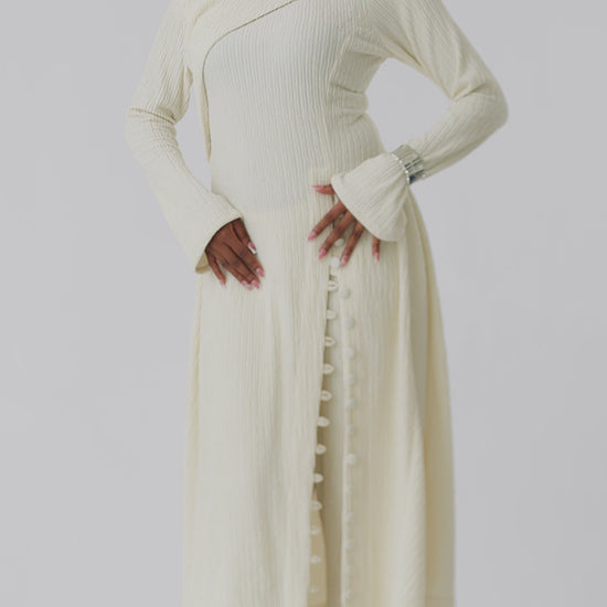 The Sculpt Pleat Co-Ord Set redefines effortless elegance. Cut from Cocomaarie’s signature crinkle-pleated stretch crepe, this two-piece ensemble pairs a softly folded sculptural asymmetric neckline frame with fluid wide-leg trousers and fabric-covered buttons running down the side seam designed to move gracefully with you, from morning meetings to late dinners to weekend activities.