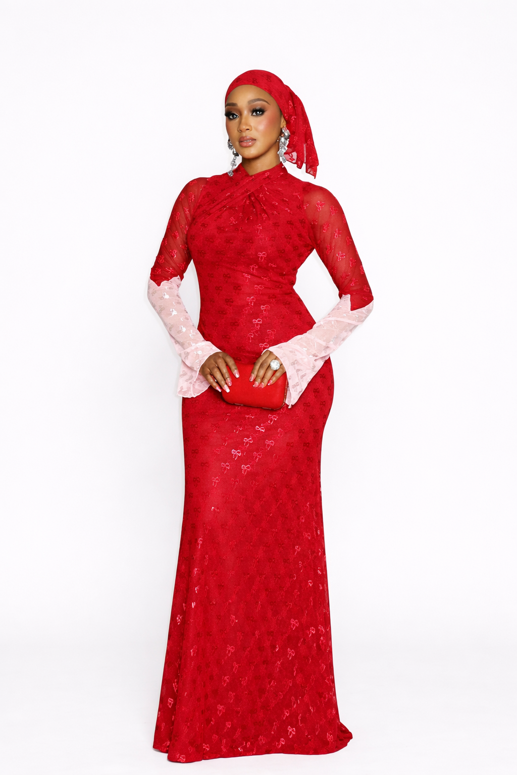 The neckline features an elegant cross-draped detail that gathers gently at the collar, creating a refined high-neck illusion. The fitted bodice transitions seamlessly into a smooth, body-contouring skirt that flares subtly at the hem for fluid movement.. The coordinating headscarf completes the look with timeless sophistication.